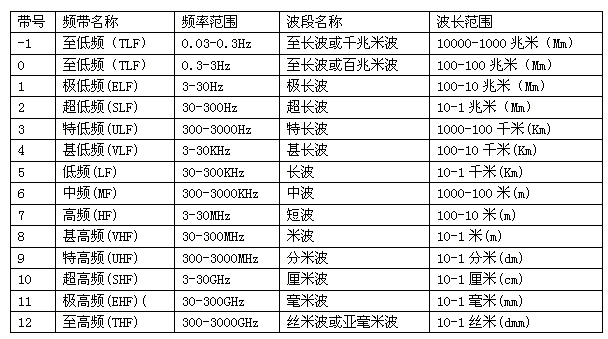 目前,根椐《中華人民共和國無線電頻率劃分規定》,我國已對9K~1000GHz頻帶內的無線電業務做出了規劃,對無線電頻帶和波段也做了命名(見表1)。